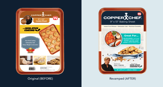 The original packaging was underwhelming, outdated, and unmemorable. The insert showed no indication of content hierarchy or shelf appeal, the logo/endorser was lost in the design, and it showed minimal diversity of product application. The heavy usage of copper tones on the packaging ultimately blended into the product itself. Copper Chef had already established itself as a premier cookware brand. How could I elevate the brand to portray this?