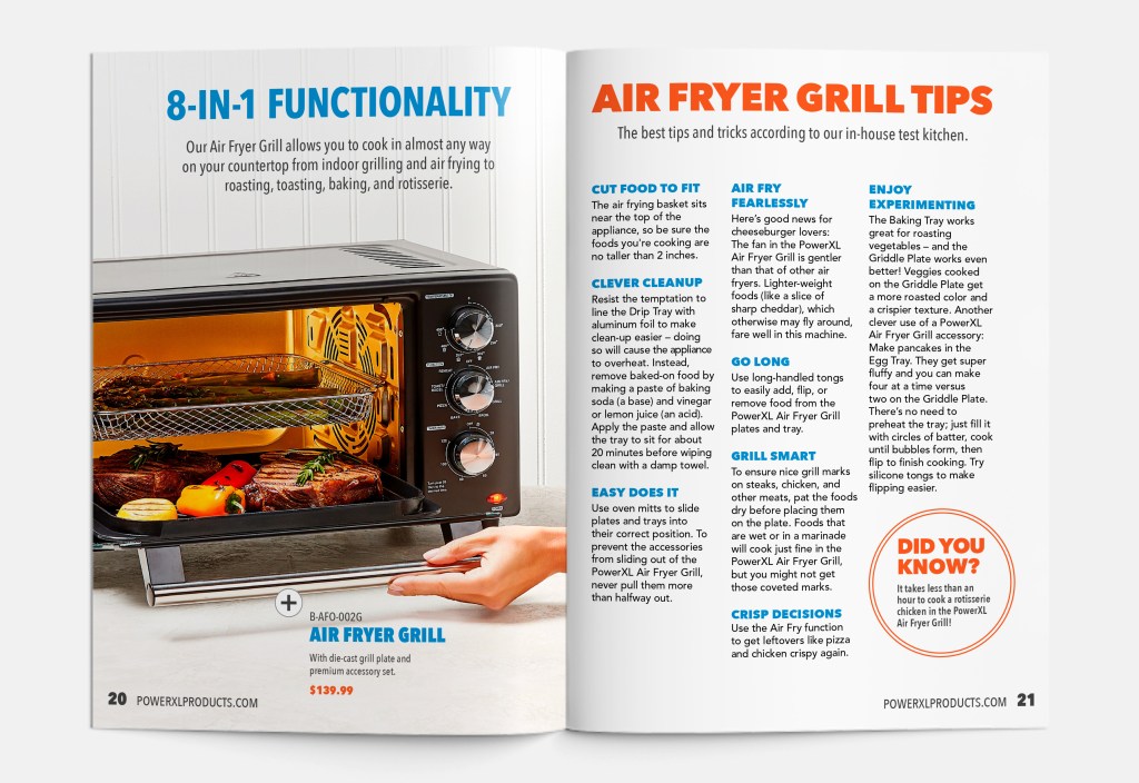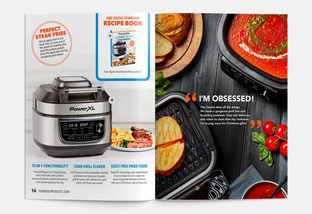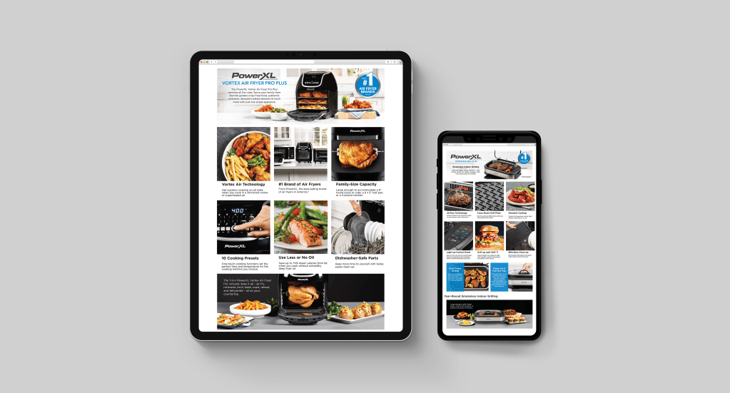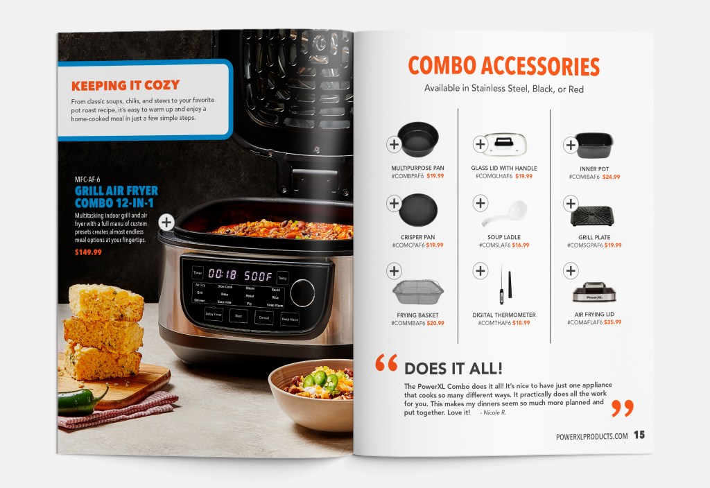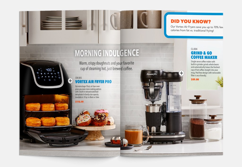 Fall digital catalog highlighting best-selling PowerXL products. Designed layout, staged set design and products, and worked with a photographer to shoot concepts. Presented final creative to executives for feedback before publishing.